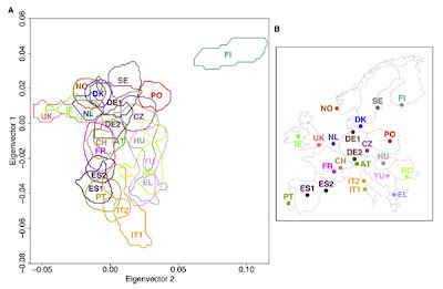I came across the article last week that detailed the genetic map of europe. Biologists have constructed a genetic map of Europe showing the degree of relatedness between its various populations.